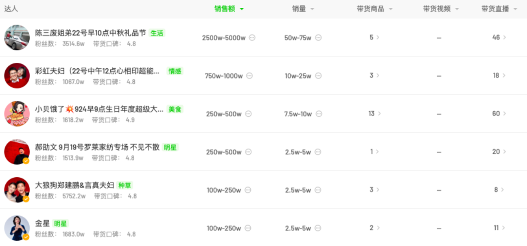 如果說2月初那天業(yè)績低迷,與未投放頭部主播有一定關(guān)系。那么在2022年10月4日這場,就算排名表中出現(xiàn)了交個朋友等頭部直播間,但GMV排名第一名的賬號粉絲量連10萬都不到。