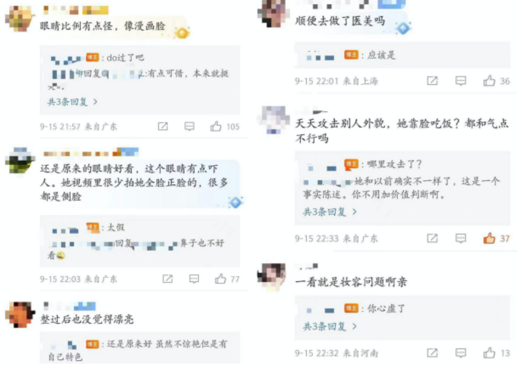 “還是原來的眼睛好看,這個眼睛有點(diǎn)嚇人。她視頻里很少拍她全臉正臉的,很多都是側(cè)臉!