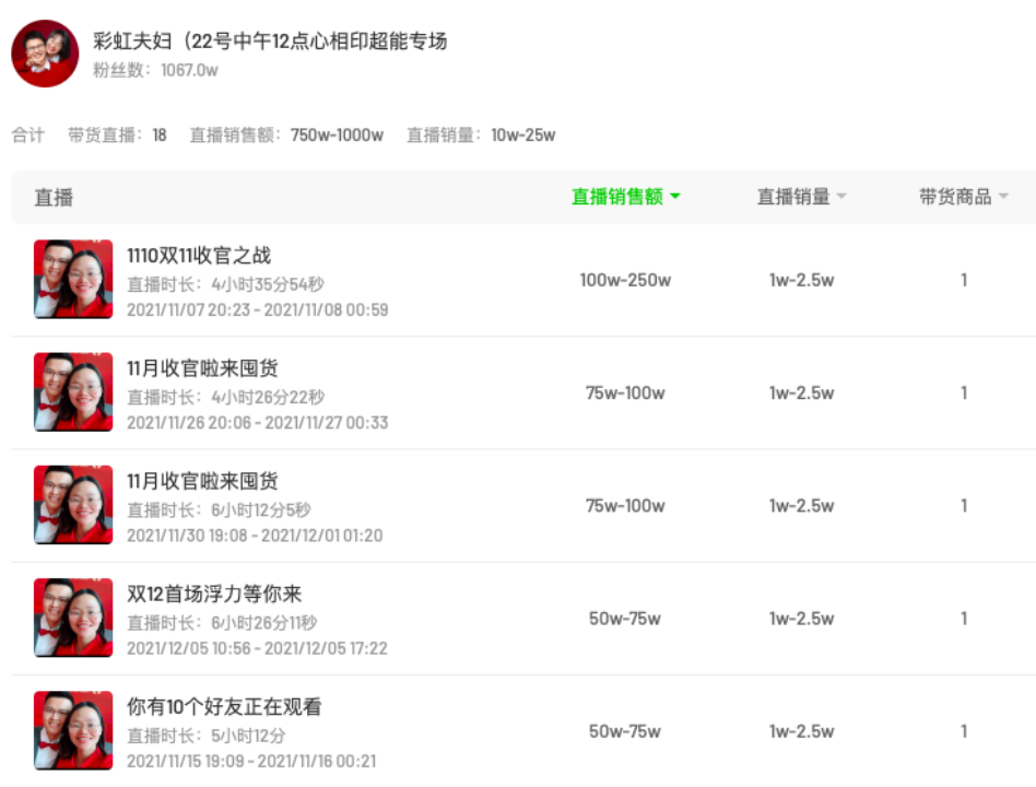 還有@彩虹夫婦的直播合作,也能達(dá)到GMV100萬-250萬、75萬-100萬。