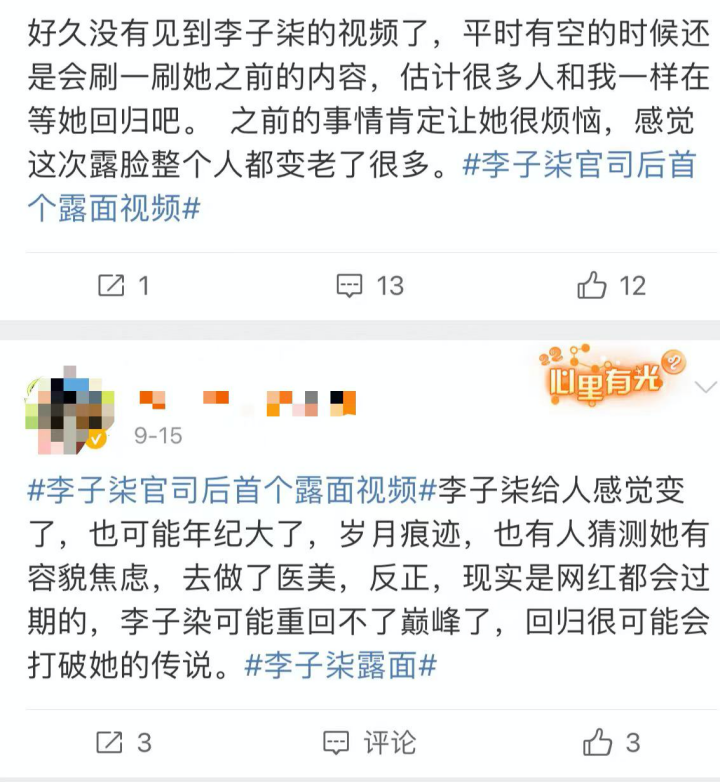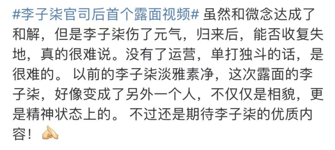 “雖然和微念達(dá)成了和解,但是李子柒傷了元?dú),歸來后,能否收復(fù)失地很難說。沒有了運(yùn)營,單打獨(dú)斗的話,是很難的。以前的李子柒淡雅素凈,這次露面的李子柒,好像變成了另一個人,不僅僅是相貌,更是精神狀態(tài)上的。不過還是期待李子柒的優(yōu)質(zhì)內(nèi)容!
