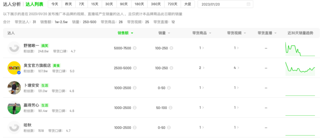 例如在1月20日,只投放了31位達(dá)人,但銷售額卻能達(dá)到2.5萬-5萬。當(dāng)日主播GMV列表中,臭寶排名以2500元-5000元GMV排名第二,再次印證臭寶旗艦店發(fā)展成熟的事實(shí)。