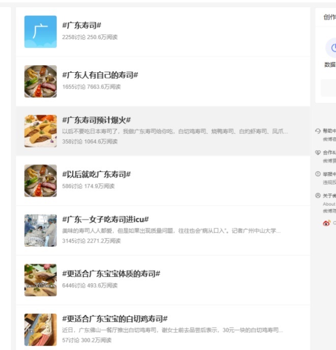 近期,比較火的“廣東壽司”,微博詞條有近1億的閱讀量。小紅書更有無數(shù)此類話題的筆記。什么是廣州壽司?就是幾家廣州餐廳結(jié)合當?shù)靥厣浊须u,配以壽司飯團和各種調(diào)料(如海苔、芝麻、蔥花、沙拉醬等)制作而成的“白切雞壽司”。這一壽司,一經(jīng)推出,就引來無數(shù)人圍觀討論。