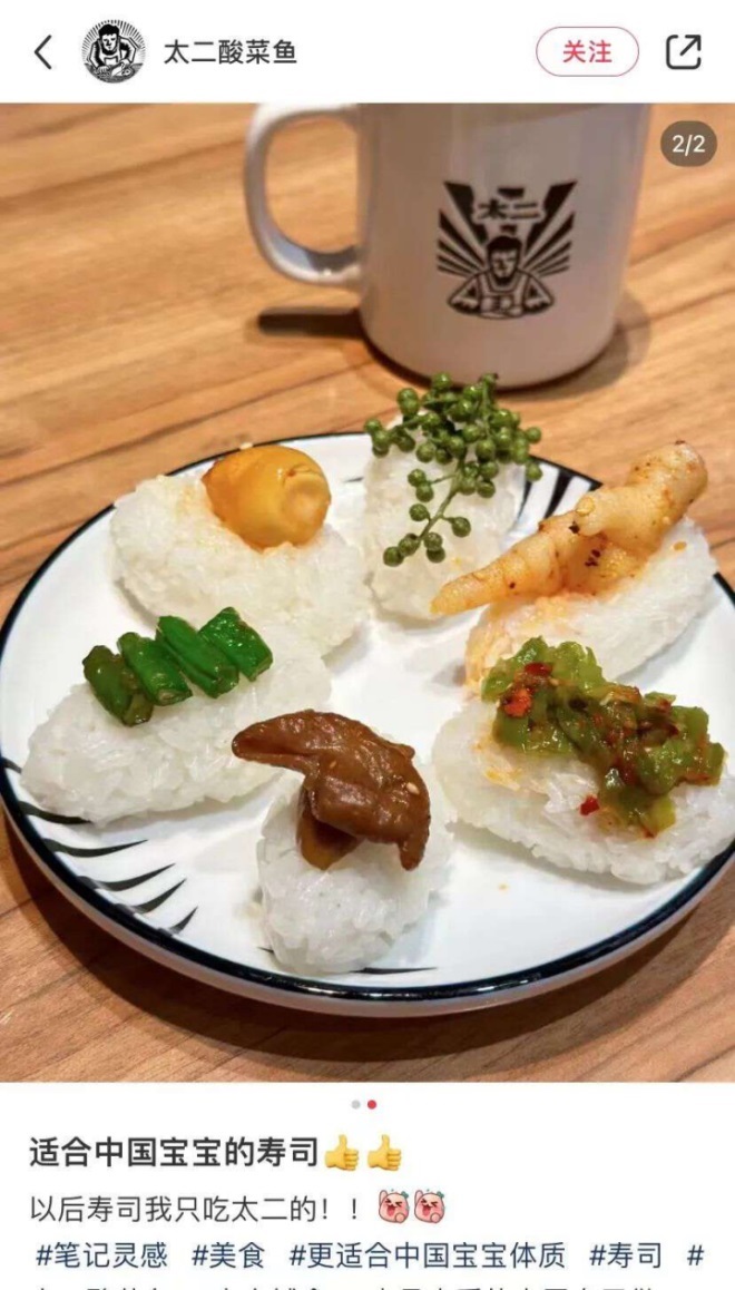 “廣東壽司”火后,一些本土品牌緊跟節(jié)奏,推出一系列“新中式壽司”。如佛山知名壽司品牌小蒲一町不甘洛后,推出了“中華創(chuàng)意壽司”系列:戀愛腦壽司(腦花+壽司)、毛肚壽司(毛肚+壽司)等;重慶一家叫奈賜壽司店推出的新中式蓋碗壽司,借助中國“蓋碗”傳統(tǒng)元素,把一系列茶葉蛋壽司、牛油果壽司等“中式壽司”盛裝到“蓋碗”中。