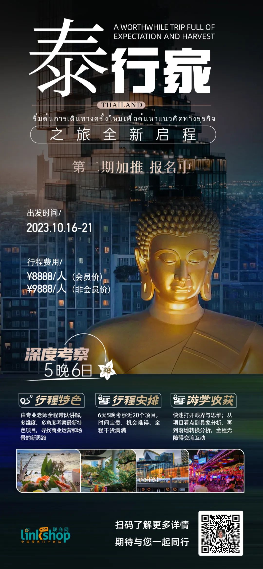 此次考察活動(dòng)時(shí)間為10月16-10月21日,考察依舊涵蓋20多個(gè)特色項(xiàng)目,并由專業(yè)老師全程帶隊(duì)講解,多維度、多角度考察泰國最新特色項(xiàng)目,尋找商業(yè)運(yùn)營和場景的新思路。此次游學(xué),您可以快速打開眼界和思維,從項(xiàng)目看點(diǎn)到具象分析,再到落地轉(zhuǎn)換分析,全程無障礙交流互動(dòng)。