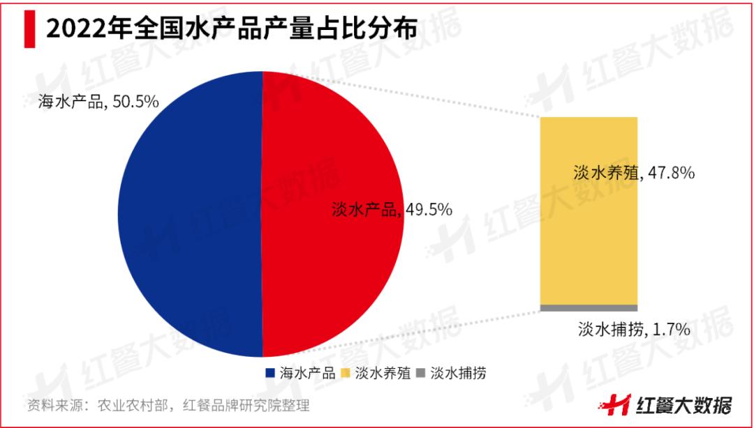 據(jù)農(nóng)業(yè)農(nóng)村部數(shù)據(jù),2022年我國水產(chǎn)品產(chǎn)量呈現(xiàn)“海淡均分”的競爭格局,其中淡水養(yǎng)殖產(chǎn)品在水產(chǎn)品中的產(chǎn)量占比高達47.8%。紅餐品牌研究院預測,食品安全問題將推動消費者不得不考慮海水產(chǎn)品的安全性,海淡水產(chǎn)平分市場的格局將被打破,淡水養(yǎng)殖產(chǎn)業(yè)景氣度有望進一步提升,產(chǎn)業(yè)或迎來加速增長。