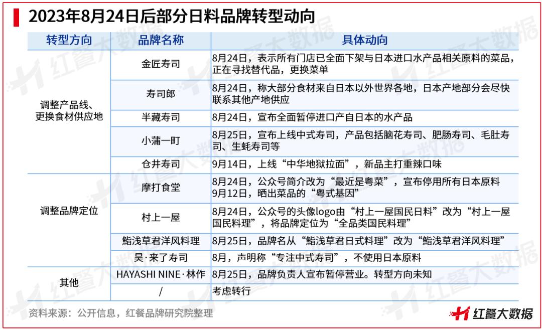 紅餐品牌研究院統(tǒng)計了2023年8月24日之后部分日料品牌的轉(zhuǎn)型動向后發(fā)現(xiàn),調(diào)整產(chǎn)品線、更換食材供應地和調(diào)整品牌定位是主流,轉(zhuǎn)行換賽道的也不在少數(shù)。