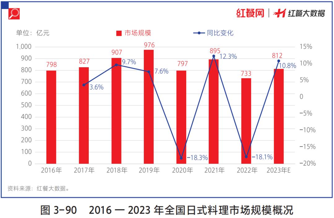 2022年,我國日式料理市場規(guī)模達733億元。進入2023年,日式料理的市場規(guī)模預計將回升至812億元。
