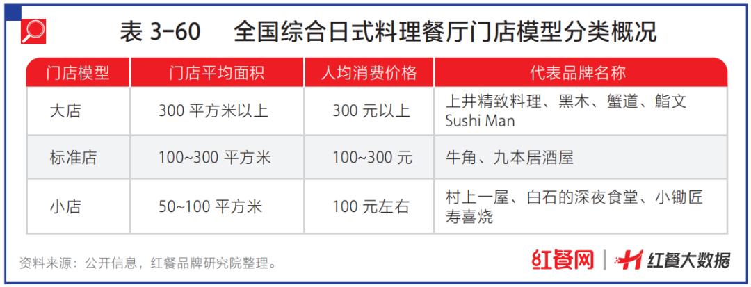 綜合日式料理是指提供多種日式料理產(chǎn)品的日式料理餐廳,門店模型與產(chǎn)品種類均較為多元化。綜合日式料理的門店經(jīng)營形式有居酒屋、放題、鐵板燒、壽喜燒等,而其提供的產(chǎn)品則有刺身、手卷、壽司、燒鳥、天婦羅、烤肉、清酒、蓋飯等。按門店模型來分,綜合日式料理可分為大店、標準店和小店模式。
