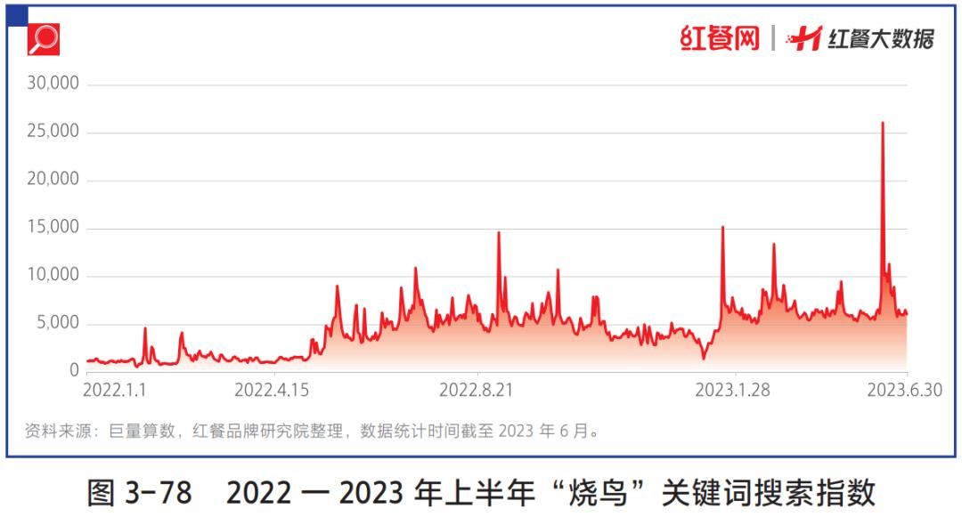 在日料的細分賽道,燒鳥也值得關注。近年來,越來越多的燒鳥專門店開始出現(xiàn),燒鳥的關注度日益高漲。從巨量算數(shù)的關鍵詞搜索指數(shù)看,從2022年5月開始,“燒鳥”一詞的搜索指數(shù)開始上漲,并保持高位狀態(tài)。