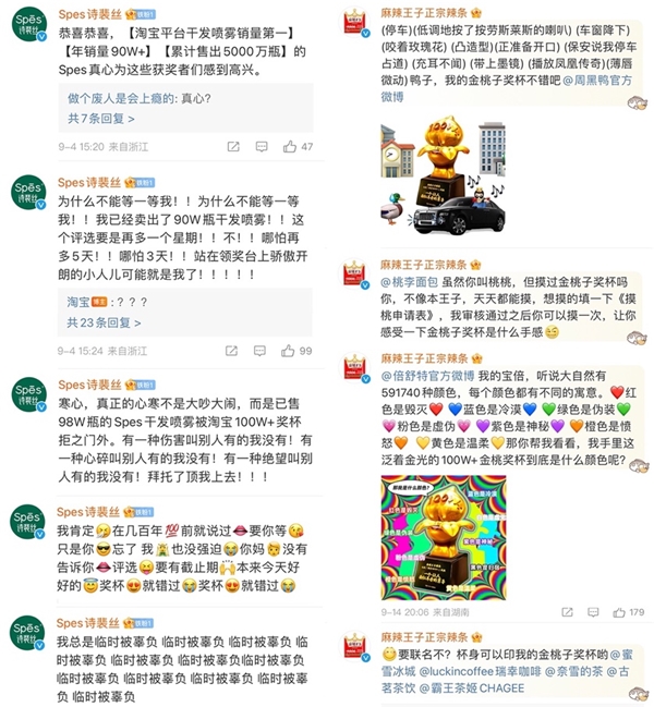 記者觀察到,因銷量98W+而與獎杯失之交臂,洗護品牌Spes詩裴在淘寶評論區(qū)開始了長達21天的“撒潑打滾”,化身段子手用“發(fā)瘋文學”來表達強烈的遺憾,甚至在自家淘寶直播間內(nèi)自行打印出獎杯以此激勵全員“搞業(yè)績”。從呼吁推遲發(fā)獎、到心有不甘、最后假裝自我和解,Spes詩裴絲對金桃子獎的渴望,成功引起了全網(wǎng)的關注并沖上熱搜。