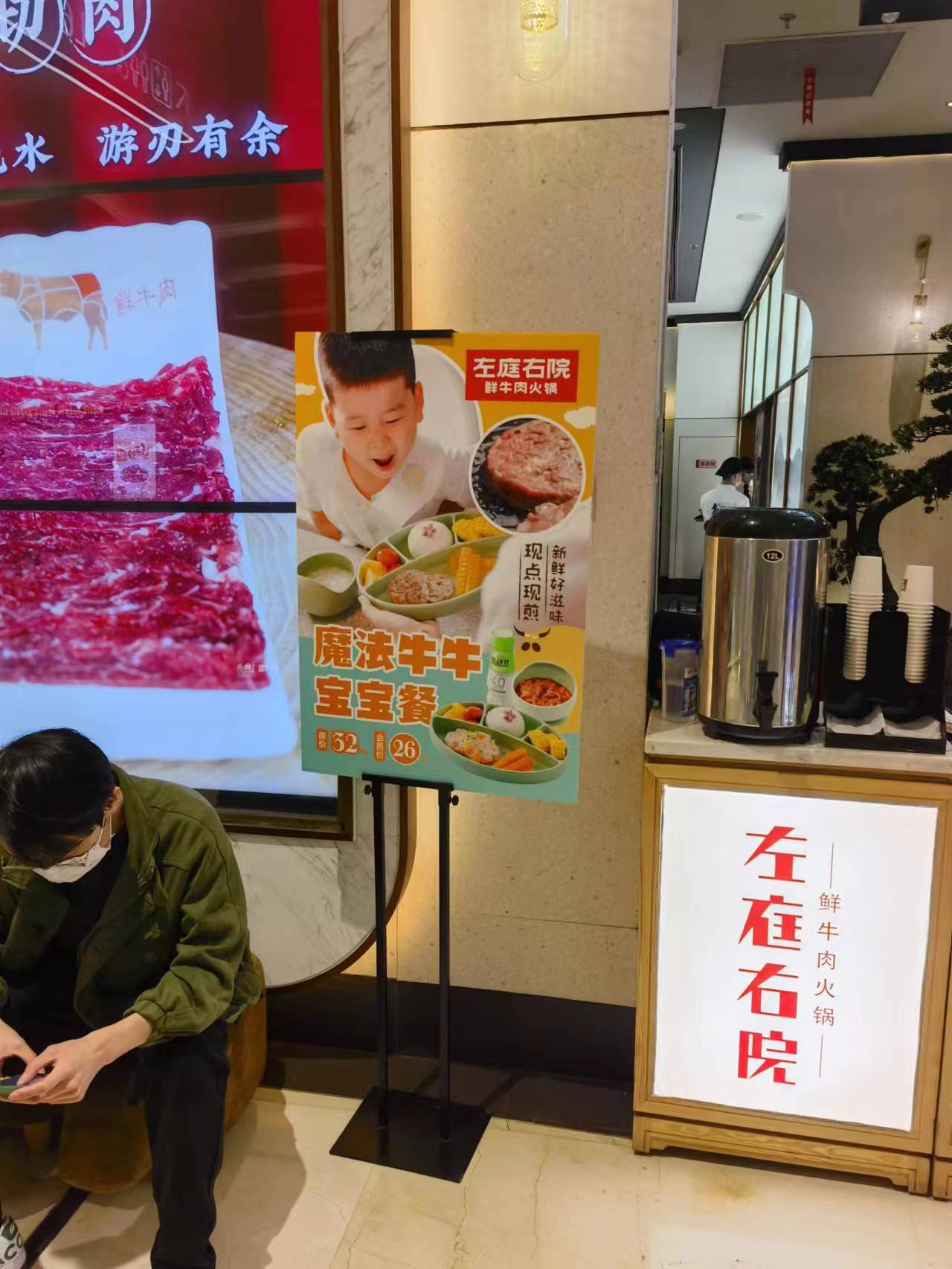 2. 有兒童餐的餐廳,大部分宣傳并不到位。西貝是我第一反應(yīng)想到有兒童餐的餐廳,這就是為什么我經(jīng)常去西貝。我后來(lái)在商場(chǎng)仔細(xì)觀察過(guò),在一層全是餐飲的樓層(估計(jì)有20家餐廳),除了西貝大概還有1-2家餐廳也提供兒童餐,只是他們沒有大力宣傳,導(dǎo)致很多家長(zhǎng)并不知道。下圖這家牛肉火鍋就是有兒童餐的餐廳,但是我對(duì)它完全沒有印象,仔細(xì)觀察了才發(fā)現(xiàn)有。