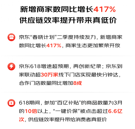 而京東今年以來,在“春曉計(jì)劃”的帶動(dòng)下,嘗到了開放生態(tài)建設(shè)帶來的“甜頭”。數(shù)據(jù)顯示,僅第二季度,京東新增商家數(shù)量實(shí)現(xiàn)同比增長417%,第三方商家數(shù)量增長超過一倍,達(dá)歷史最高。