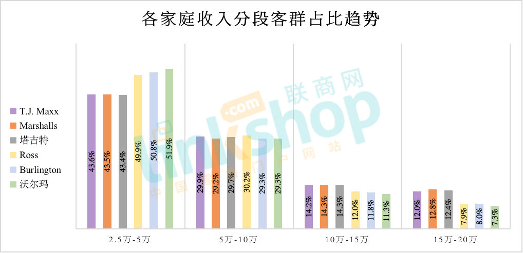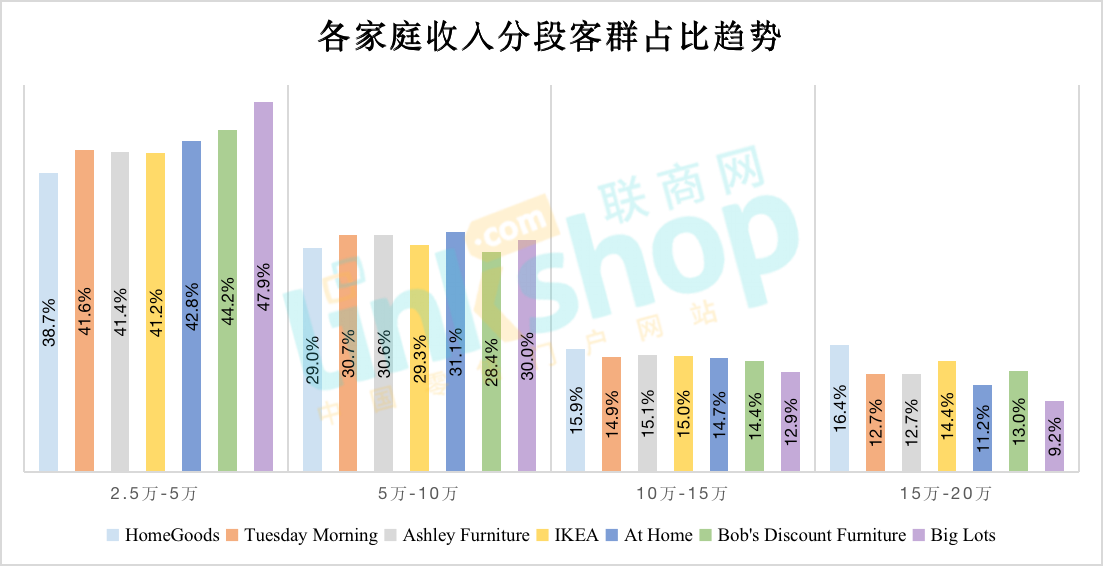 同樣的,再對(duì)比下TJX旗下主打的家居品牌HomeGoods。對(duì)比另外六家業(yè)內(nèi)知名的家居零售商可知,HomeGoods在家庭收入低于10萬(wàn)美元的客群中占比最低,但卻在家庭收入高于10萬(wàn)美元的區(qū)間占比最高。這也說(shuō)明,該品牌成功將自己打造為吸引高收入消費(fèi)者的價(jià)值零售商。