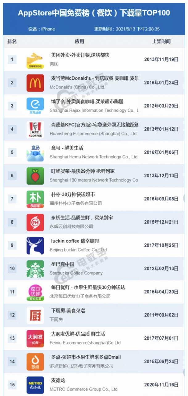 入圍該榜單TOP10的APP分別是:餓了么、肯德基KFC、美團(tuán)外賣、瑞幸咖啡、盒馬、麥當(dāng)勞、 庫(kù)迪咖啡、永輝生活、星巴克中國(guó)、大潤(rùn)發(fā)優(yōu)鮮。
