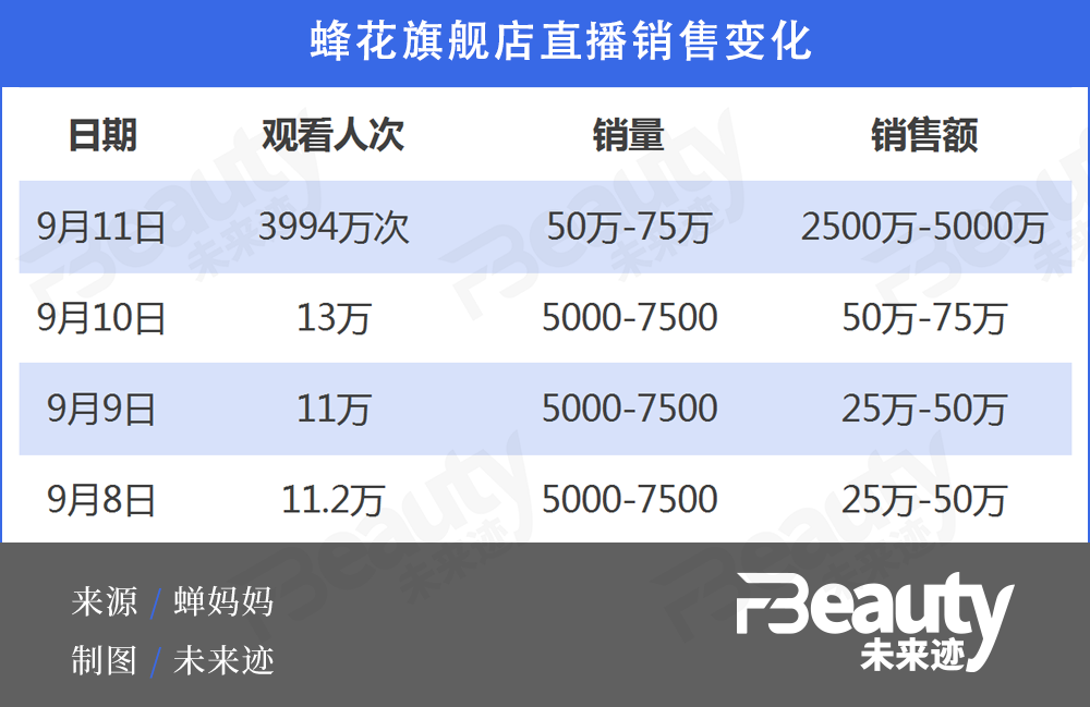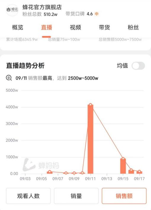 直播觀看人次也從平時的10萬人次左右,暴漲到3000多萬人次。這直接拉動銷售額從平時的25萬元到50萬元之間每場,暴漲到2500萬元到5000萬元之間。