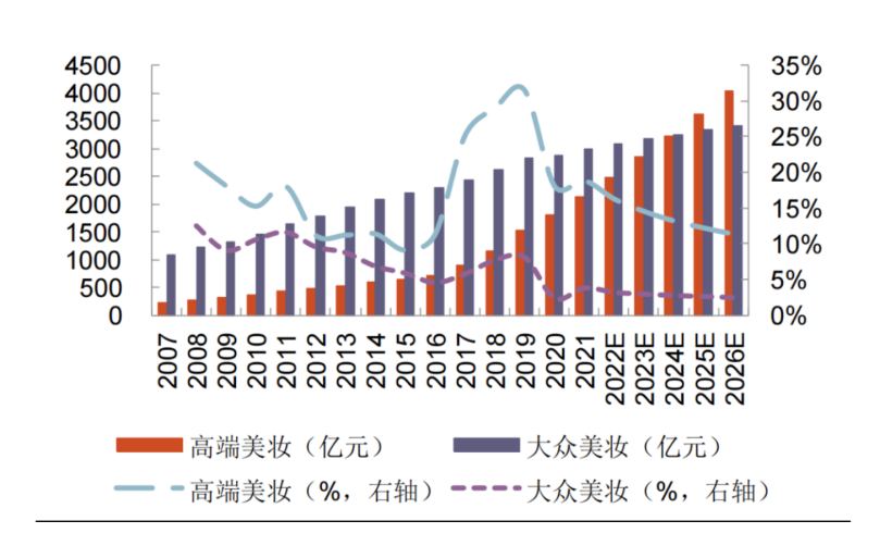 歐睿國際的數(shù)據顯示,在中國市場,2017年以前大眾美妝的消費金額在市場中占據著絕對領先的地位。但是2017年之后,高端美妝消費市場持續(xù)攀升。預計到2024年,高端美妝和大眾美妝的消費金額或將持平,并在2024年過后反超大眾美妝。