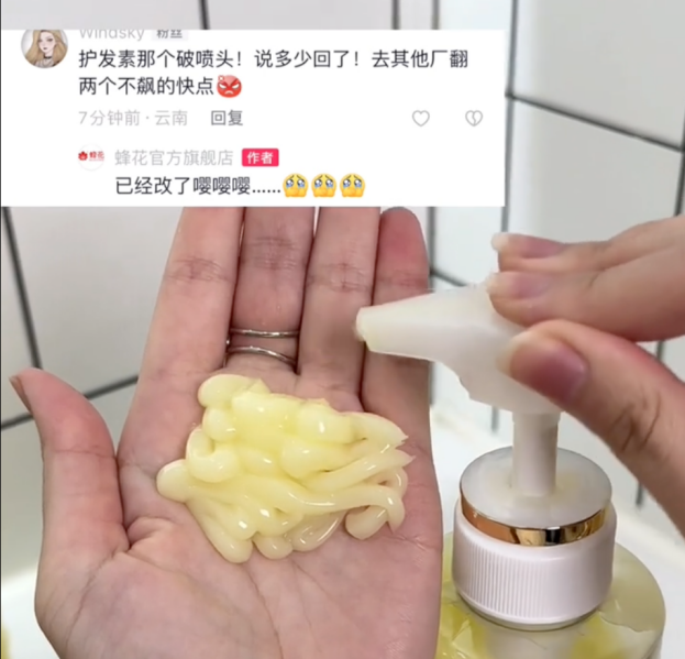 事情的起因是消費者反饋蜂花護發(fā)素的泵頭壓力過大,按壓下去后經常會濺到身上或者墻上。蜂花在收到反饋后,從善如流連夜改噴頭。