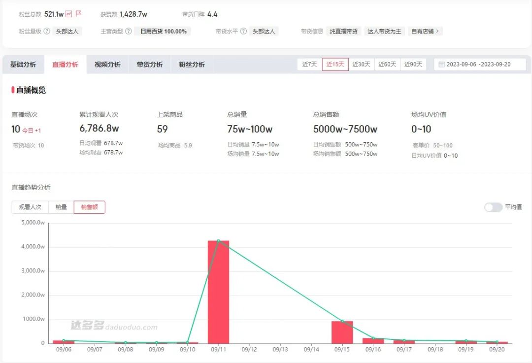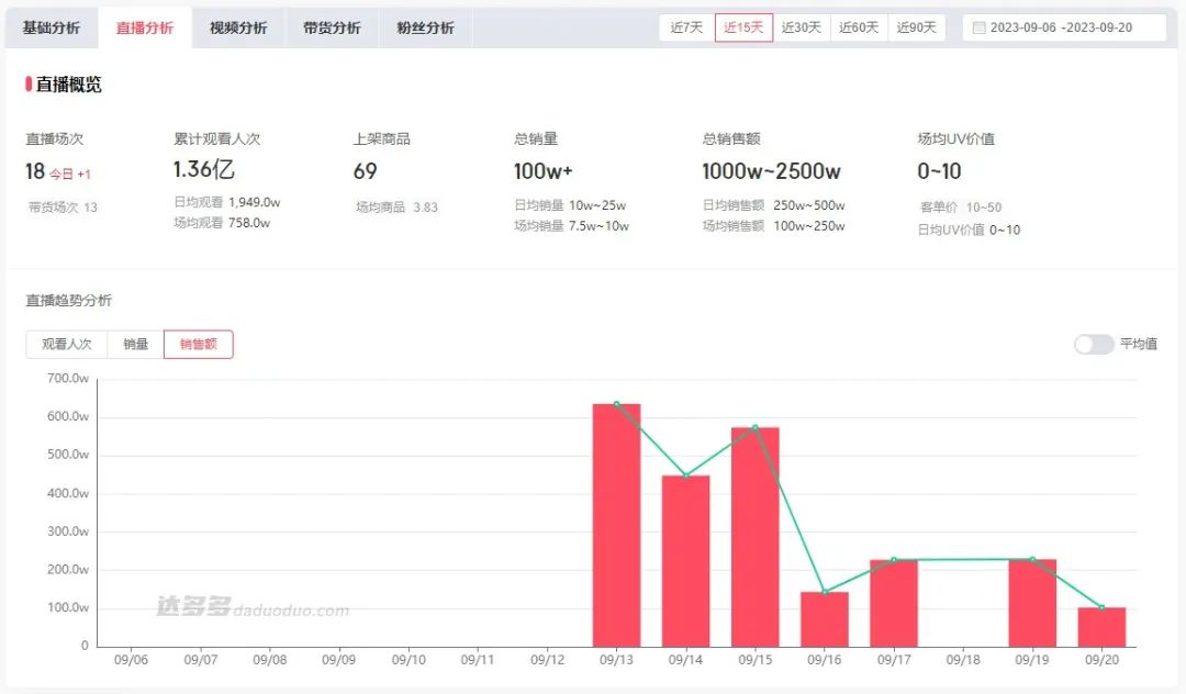 據(jù)達(dá)多多數(shù)據(jù)顯示,自從9月11日實(shí)現(xiàn)2500~5000萬的GMV后,蜂花旗艦店直播間的GMV一直在下跌。