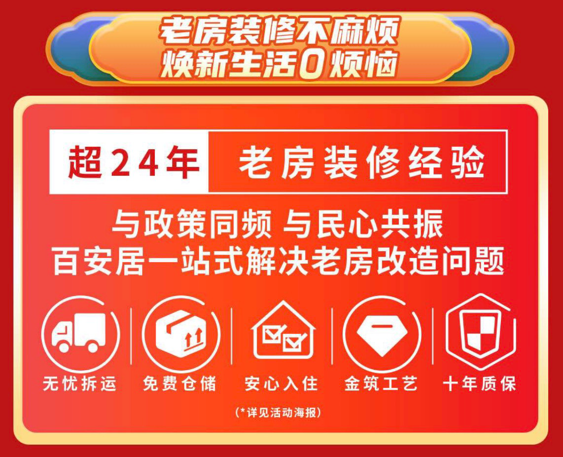 百安居擁有超24年老房裝修經(jīng)驗(yàn),一站式服務(wù)切實(shí)解決老房翻新搬家、倉儲等一系列難題,并運(yùn)用環(huán)保施工工藝帶來更舒心、美好的宜居家園,助力消費(fèi)者煥新生活0煩惱。以6天爆改廚房間、7天爆改衛(wèi)生間為代表的單項(xiàng)局裝業(yè)務(wù)也為極速煥新打造出品質(zhì)范本,以實(shí)際舉措帶動(dòng)局部改造消費(fèi),并推動(dòng)促進(jìn)家居消費(fèi)政策措施盡快落地見效。