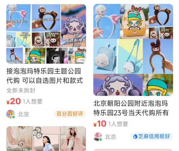 樂(lè)園營(yíng)業(yè)前近一個(gè)月,泡泡瑪特發(fā)布了《樂(lè)園購(gòu)物指南已上線》文章,向游客展示了樂(lè)園的幾十款限定周邊。這些商品包括背包、手機(jī)殼、冰箱貼、玩偶等等。在閑魚和小紅書上,只需支付10元代購(gòu)費(fèi)和順豐到付運(yùn)費(fèi),買家就能從黃牛手中拿到這些商品。如果采購(gòu)量大,黃牛還會(huì)酌情提供優(yōu)惠。