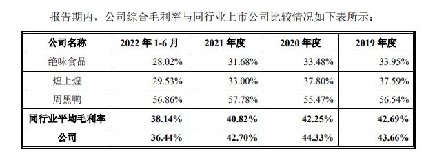 從綜合毛利率來(lái)看,德州扒雞2019年—2022年上半年毛利率分布為43.66%、44.33%、42.7%和36.44%;雖低于周黑鴨,但高于同期的絕味食品和煌上煌,甚至比同行平均毛利率水平還要高。
