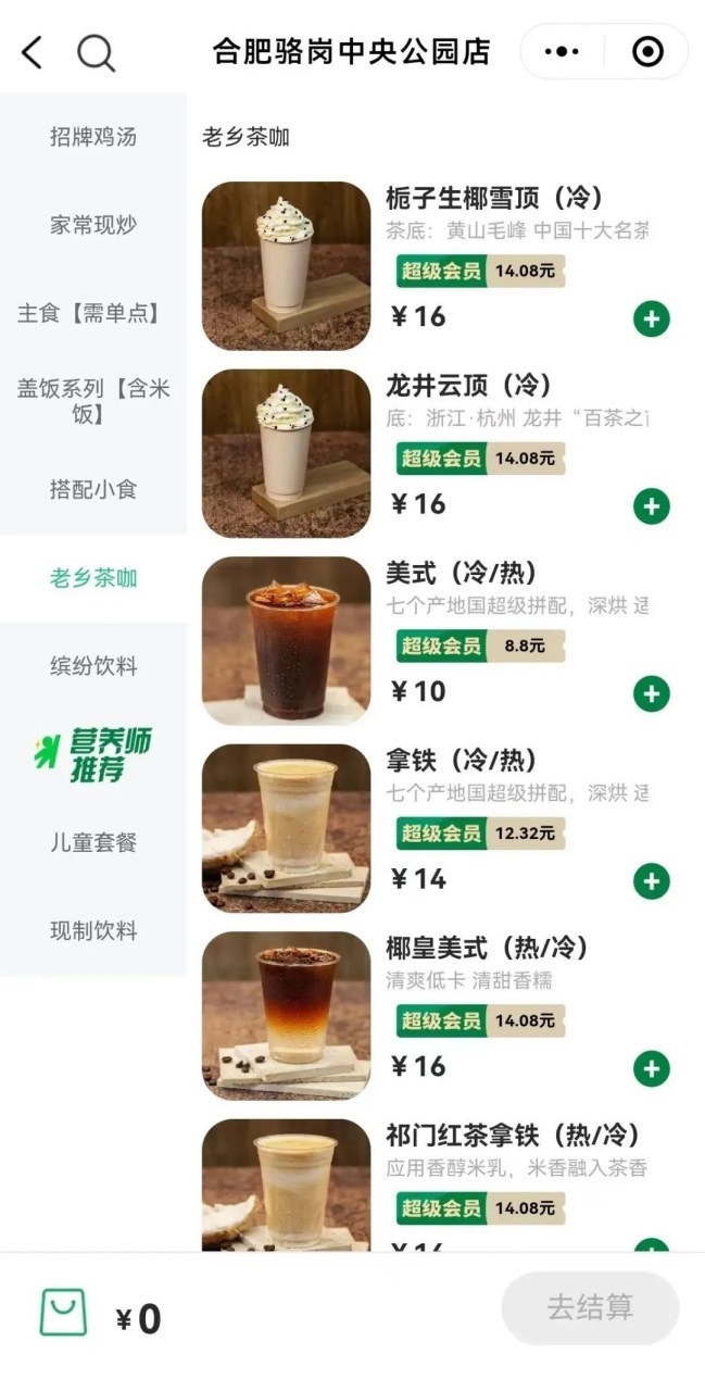 茶飲產(chǎn)品包括鮮牛乳茶、雪頂茶等;咖啡類產(chǎn)品包括美式、拿鐵等;部分單品只能制作冷飲,定價從10~18元不等,使用品牌超級會員可以打88折,一杯美式最低至8.8元。