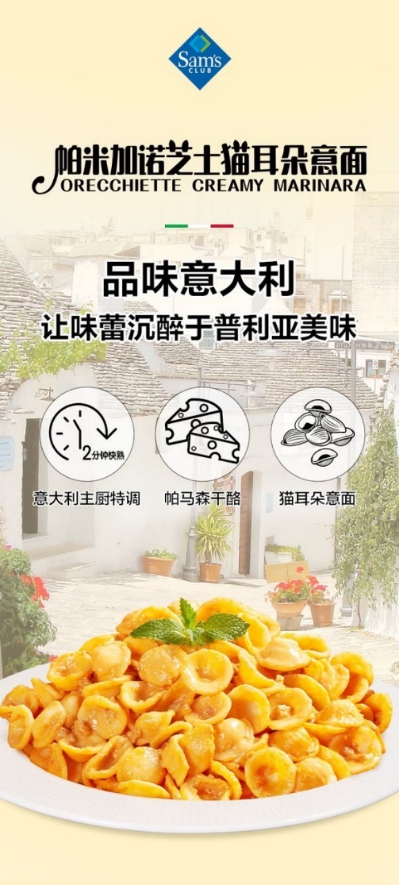 “食貫中西”一直是會員餐桌的食味風格,為豐富選擇性,山姆推出帕米加諾芝士貓耳朵意面,由意大利主廚特調,精選歐盟DOP認證的帕馬森干酪,新西蘭稀奶油與意大利進口杜蘭小麥貓耳朵意面,僅需兩分鐘即可品嘗到地道的意式美食。