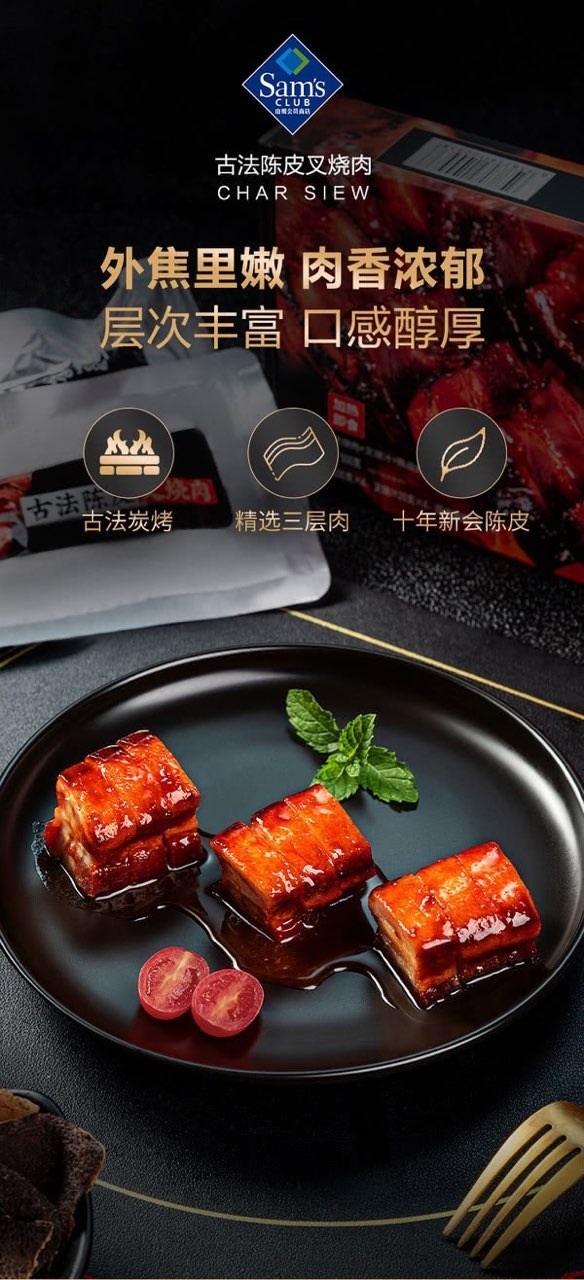 例如,市面上少見的古法陳皮叉燒肉,因配料、烤制過程復雜。山姆為了讓會員享受更加地道的風味,精心遵循傳統(tǒng)制作方法,選用十年新會陳皮,古法炭烤,研制出肥而不膩的古法陳皮叉燒肉,僅需微波爐中高火加熱一分半鐘,即可吃到媲美餐廳的美味。