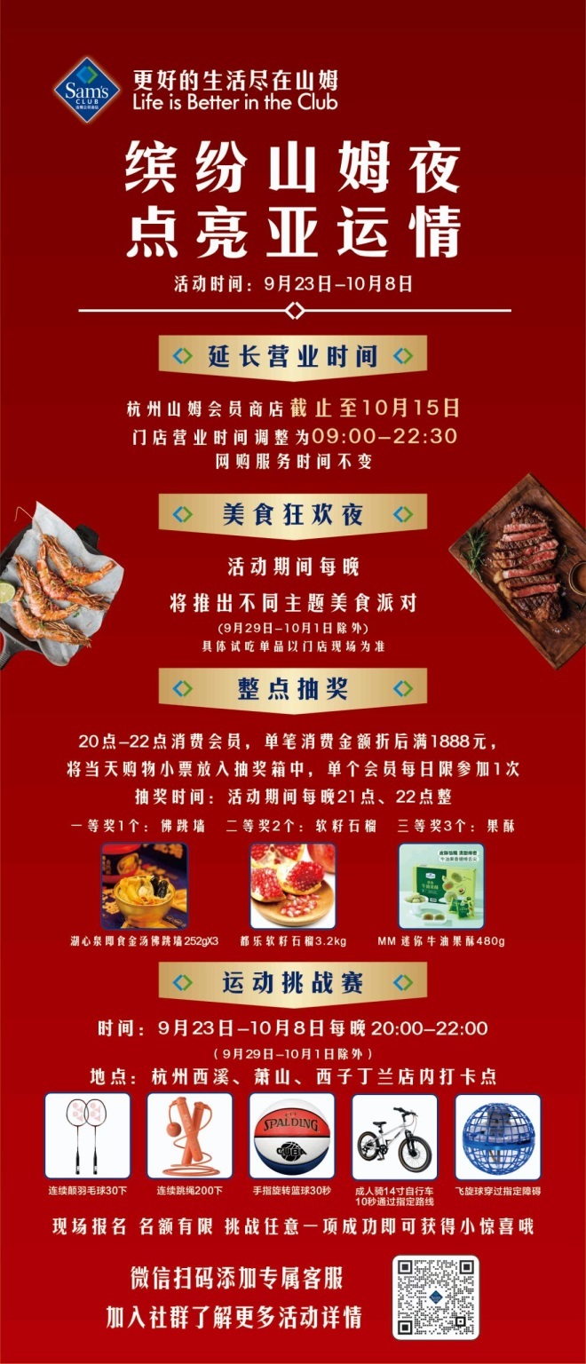 蕭山山姆會員店為慶祝第19屆杭州亞運會,門店營業(yè)時間在9月16日至10月15日期間調整為09:00-22:30,比以往營業(yè)時間延長半小時,網(wǎng)購服務時間不變。同時,蕭山山姆店在亞運會期間還推出各種會員喜愛的活動,如每晚推出不同主題的美食派對(9月29日-10月1日除外)、在每晚8點到10點期間單筆消費金額折后滿1888元的會員可參與“整點抽獎”活動。此外,蕭山山姆店每晚(9月29日-10月1日除外)在線下舉行運動挑戰(zhàn)賽,比賽項目包含羽毛球、跳繩、籃球、自行車以及飛旋球,到點現(xiàn)場報名,挑戰(zhàn)任意一項成功即可獲得山姆提供的小驚喜!