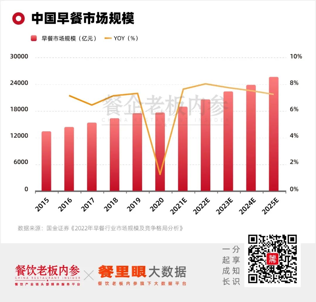 《2022年早餐行業(yè)市場規(guī)模及競爭格局分析》顯示,早餐場景目前行業(yè)規(guī)模約2萬億元,預(yù)計(jì)行業(yè)規(guī)模將持續(xù)增長,至2025年可達(dá)2.6億元。