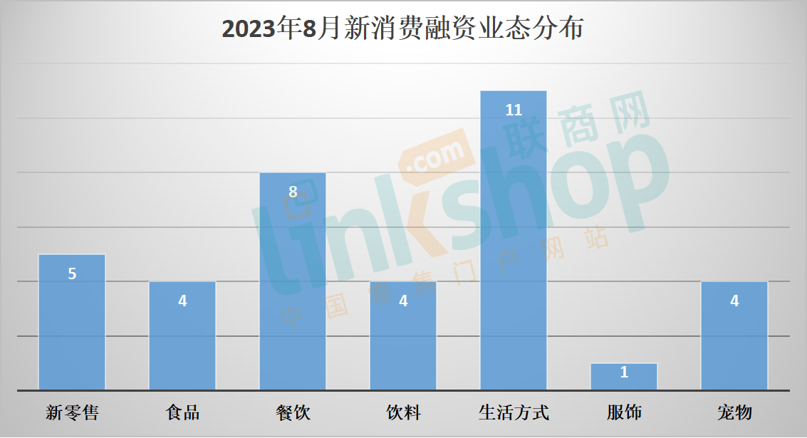 從融資業(yè)態(tài)分布來看,生活方式賽道融資事件最為密集,共發(fā)生11起,融資金額最大的是蛙聲科技,其C輪融資約億元;緊隨其后的是餐飲賽道,共發(fā)生8起,融資金額最大的是兩瑞咖啡,其獲得貝恩資本6000萬元戰(zhàn)略投資。