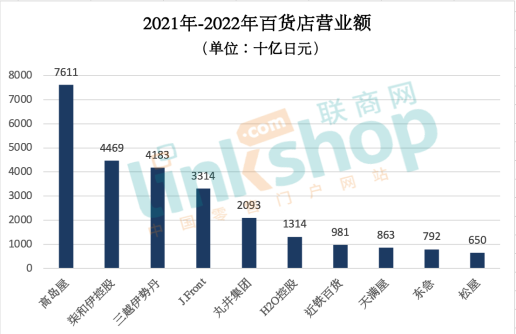 2021年至2022年日本百貨店?duì)I業(yè)額排名,大型公司優(yōu)勢(shì)明顯。 來源:業(yè)界動(dòng)向サーチ 制圖:聯(lián)商翻譯中心