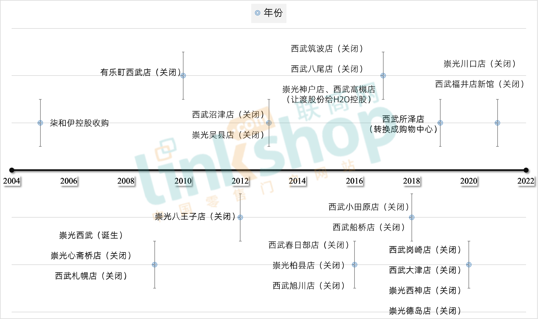 崇光·西武百貨店主要店鋪閉店及購(gòu)物中心業(yè)態(tài)轉(zhuǎn)換的歷史。數(shù)據(jù)來源:DIAMOND Online制圖:聯(lián)商翻譯中心