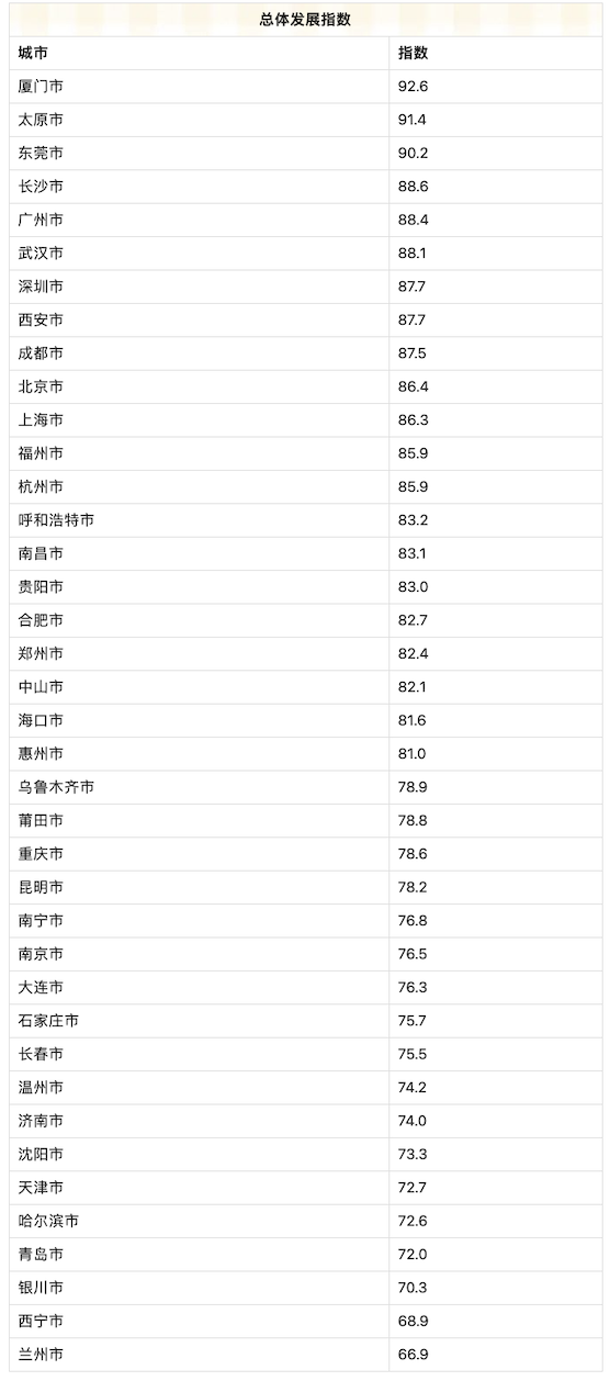 指數(shù)的核心數(shù)據(jù)為各城市便利店的飽和度、門店總量的增速、24小時便利店的比例及營商環(huán)境情況。在此基礎(chǔ)上,計算出了各城市的便利店發(fā)展指數(shù)。其中,廈門、太原、東莞、長沙、廣州的便利店發(fā)展指數(shù)名列前五位。