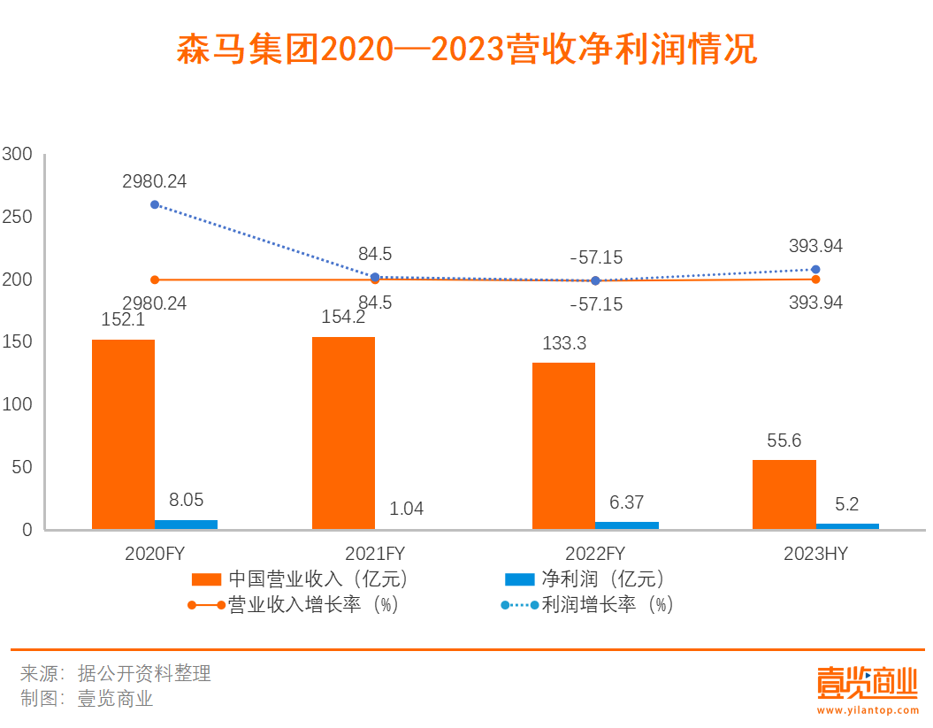 一方面,從營收來看。森馬近四年的營收增速一度停滯,甚至出現(xiàn)了下跌趨勢。據(jù)財報顯示,森馬集團(tuán)2020-2022年以及2023年上半年營收分別為152億元、154.1億元、133.3億元、55.6億元,營收同比增速分別為-21.4%、1.4%、-13.5%、-1.44%,僅有2021年營收增速為正,其余兩年營收都呈下降趨勢,由此可見森馬目前營收已經(jīng)到達(dá)瓶頸,僅靠現(xiàn)有業(yè)務(wù),森馬很難再往前走了。