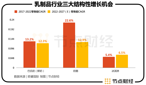 算上液態(tài)奶中的鮮奶,其2019年-2022年的復(fù)合增速為13.2%,被預(yù)測(cè)2022年-2027年的復(fù)合增速為12.3%。在乳制品行業(yè)中,“奶酪、鮮奶、冰淇淋”三大最顯見的結(jié)構(gòu)性機(jī)會(huì)已經(jīng)出現(xiàn)了。