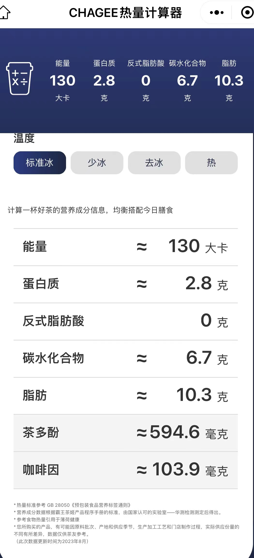 比如“伯牙絕弦”這款產(chǎn)品,選擇中杯、不另外加糖、標(biāo)準(zhǔn)冰,即可得出這杯飲品有約130 大卡的熱量、2.8克蛋白質(zhì)、6.7克碳水化合物、10.3克脂肪,以及茶多酚約594.6毫克、咖啡因約103.9毫克。