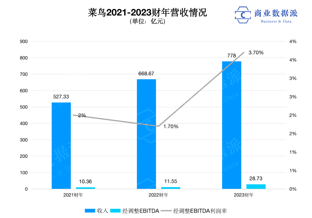 據(jù)招股書,2021至2023財(cái)年,菜鳥分別實(shí)現(xiàn)營收527億元、669億元和778億元,合計(jì)1974億元;今年4-6月,菜鳥收入為231.6億元,相當(dāng)于日入近3億元。