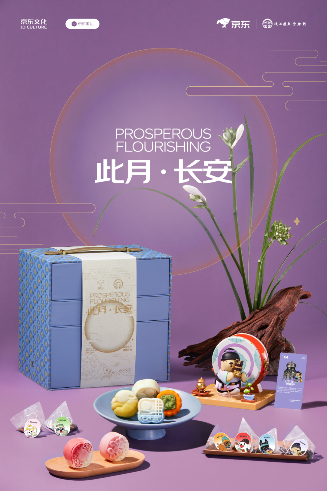 京東的中秋禮盒被命名為“此月·長安”,和上面的選手一樣很有來頭,由京東與陜西歷史博物館聯(lián)袂呈現(xiàn),并融入了可追溯的文物原型。