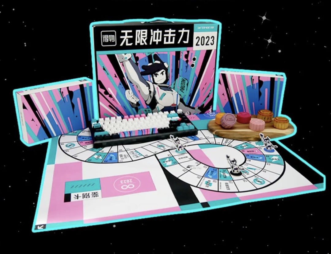 今年中秋,得物全家桶的主題是不被定義的“無限沖擊力”。相較于月餅,炫酷的定制鍵盤和定制鍵帽看上去更像主角。紅藍(lán)黑白的漫畫風(fēng)透著賽博朋克的時髦味道,這種氣質(zhì)在互聯(lián)網(wǎng)公司里恐怕是獨一份。