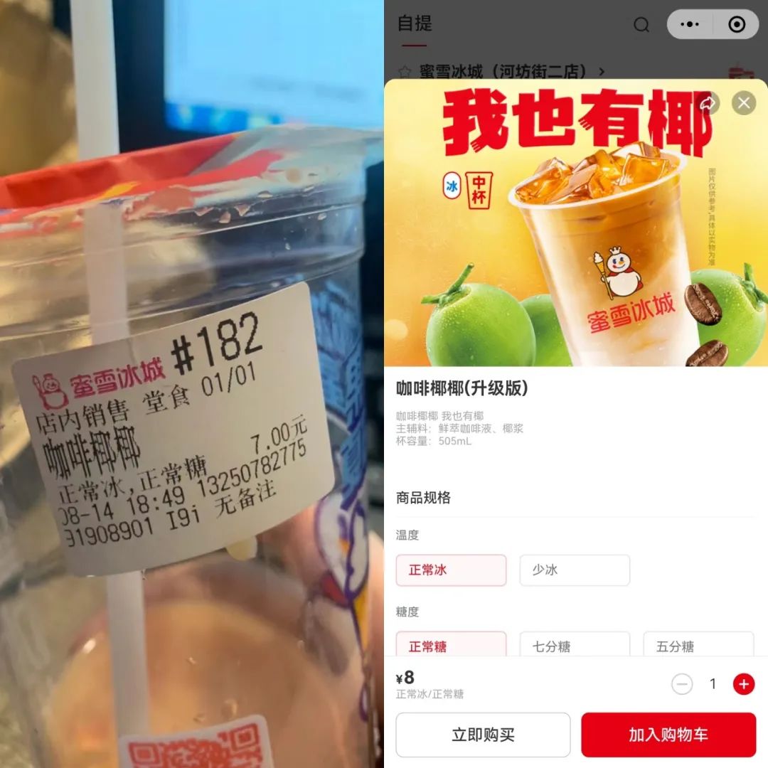 蜜雪冰城的“咖啡椰椰”單價在7元,曾被稱為“生椰拿鐵”平替,這次漲到8元,一些網(wǎng)友表示再加0.8元就能買庫迪,加1.9元就能買瑞幸,“平替不香了”。