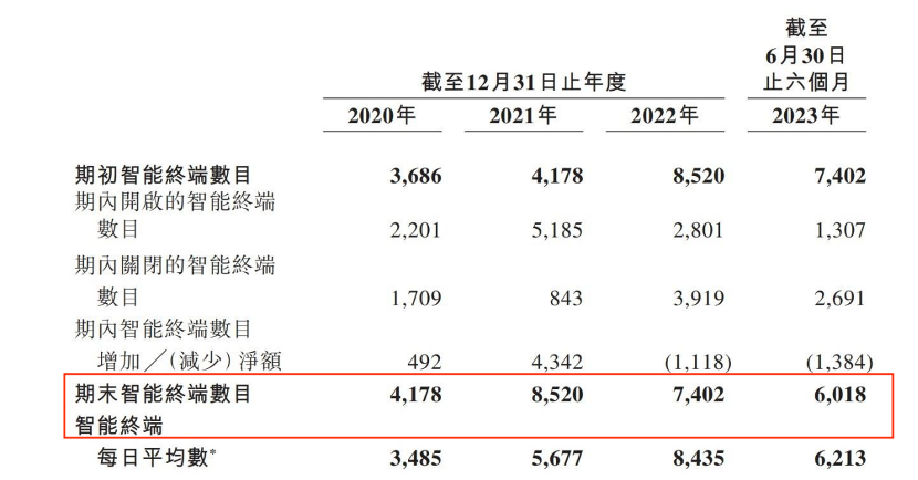 2020年-2023年6月,智能終端數(shù)量分別為4178臺(tái)、8520臺(tái)、7402臺(tái)、6018臺(tái)。從2021年開(kāi)始的短短一年半時(shí)間,智能終端數(shù)量減少了約2500臺(tái)。