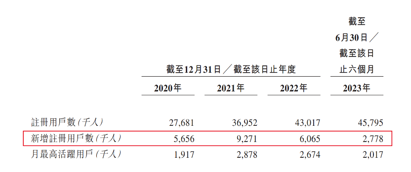招股書顯示,2020年-2023年6月,企業(yè)的新增注冊(cè)用戶分別為565.6萬(wàn)人、927.1萬(wàn)人、606.5萬(wàn)人、277.8萬(wàn)人。由此可見(jiàn),新增注冊(cè)用戶數(shù)在2021年到達(dá)頂峰之后,迅速滑落。