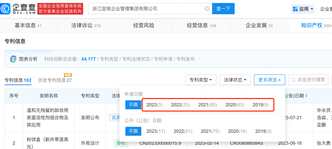 目前,“5年規(guī)劃”已過一年半,根據(jù)企查查可見,花西子所屬的浙江宜格企業(yè)管理集團(tuán)有限公司在這期間共新增20個專利信息,其中,今年僅有3個。