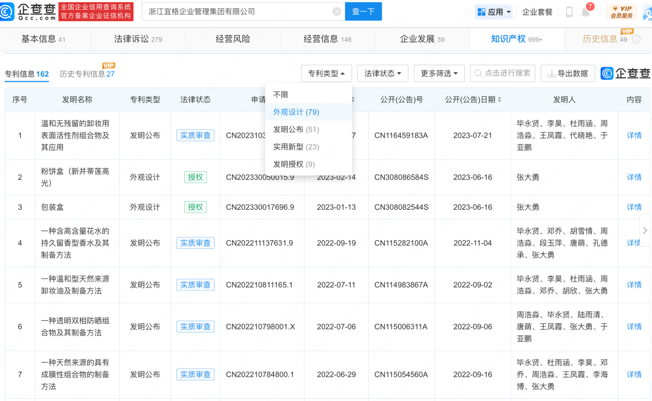 總體來看,花西子162個專利信息中,外觀設(shè)計(jì)79個,占比48.77%,將近一半。