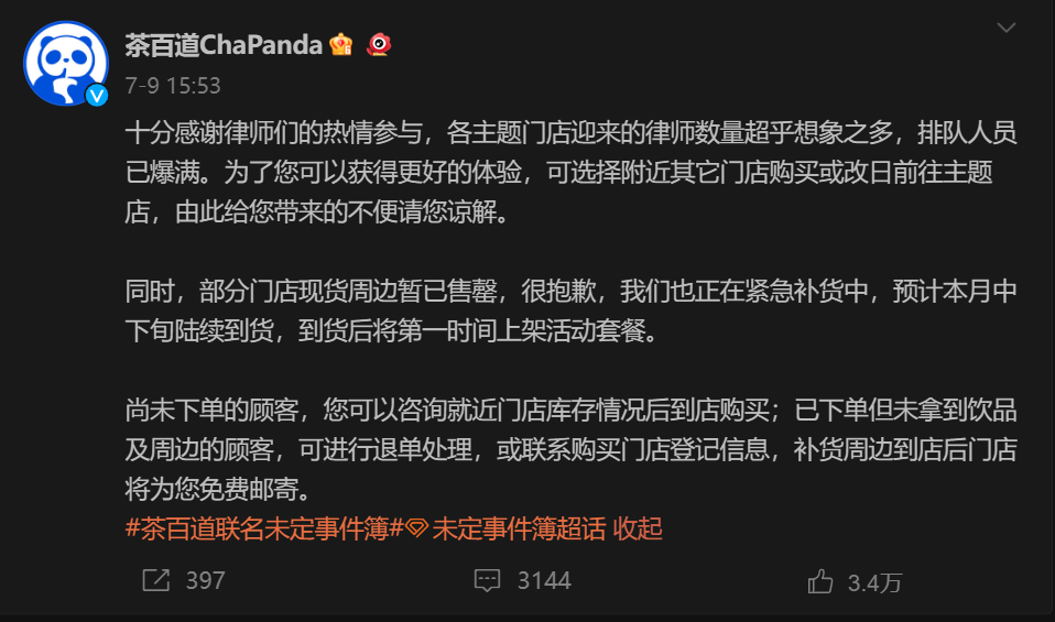 最后,真誠(chéng)售后。周邊售罄,品牌官方賬號(hào)誠(chéng)懇發(fā)文,致謝加感到抱歉,并提供解決方案,維系好感。
