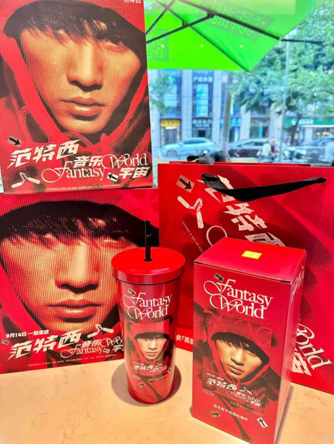 聯(lián)名產(chǎn)品周邊和大IP結(jié)合度很高。聯(lián)名的專輯范特西,是周杰倫專輯中,封面扎眼,并且人像面積很大,比較清晰的一張,識(shí)別度高。聯(lián)名的包裝袋、杯子瓶身、包括禮盒等,都采用了這張專輯原版的圖像,這更能讓消費(fèi)者將聯(lián)名和周杰倫的IP聯(lián)合起來。