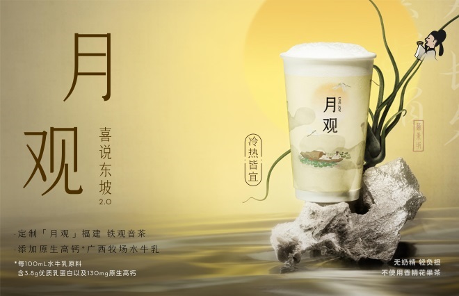 月觀是喜茶在中秋節(jié)前夕,推出的清爽茗奶茶系列新品,上線后迅速登上喜茶門店銷量榜首位置,目前銷量已突破270萬杯。月觀的火熱源自其真品質(zhì)的原料和激發(fā)節(jié)日喜悅的體驗。月觀首次使用產(chǎn)自福建安溪的月觀鐵觀音茶底,融合廣西牧場水牛乳,帶來全新清爽茗茶體驗。同時,喜茶延續(xù)了中式靈感風(fēng)格,結(jié)合蘇東坡名作《水調(diào)歌頭·明月幾時有》,定制打造節(jié)日主題產(chǎn)品包材、周邊、音樂等,為消費者營造別具一格的佳節(jié)氛圍。
