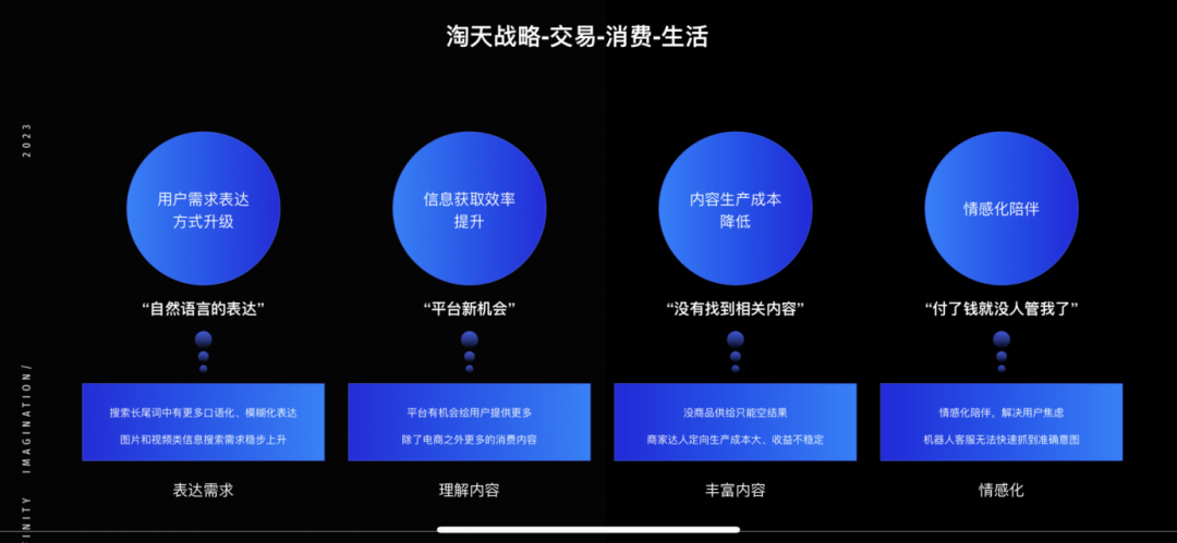 這些原先在淘寶沒法匹配到結(jié)果的搜索詞,現(xiàn)在通過生成式AI的能力,也可以得到解決方案!敖裉煳覀冋J(rèn)為,隨著技術(shù)發(fā)展,我們有機(jī)會(huì)解決這些問題。不再局限在交易,也包含消費(fèi)、生活的問題,這和我們‘從交易到消費(fèi)’的公司戰(zhàn)略,是非常契合的!
