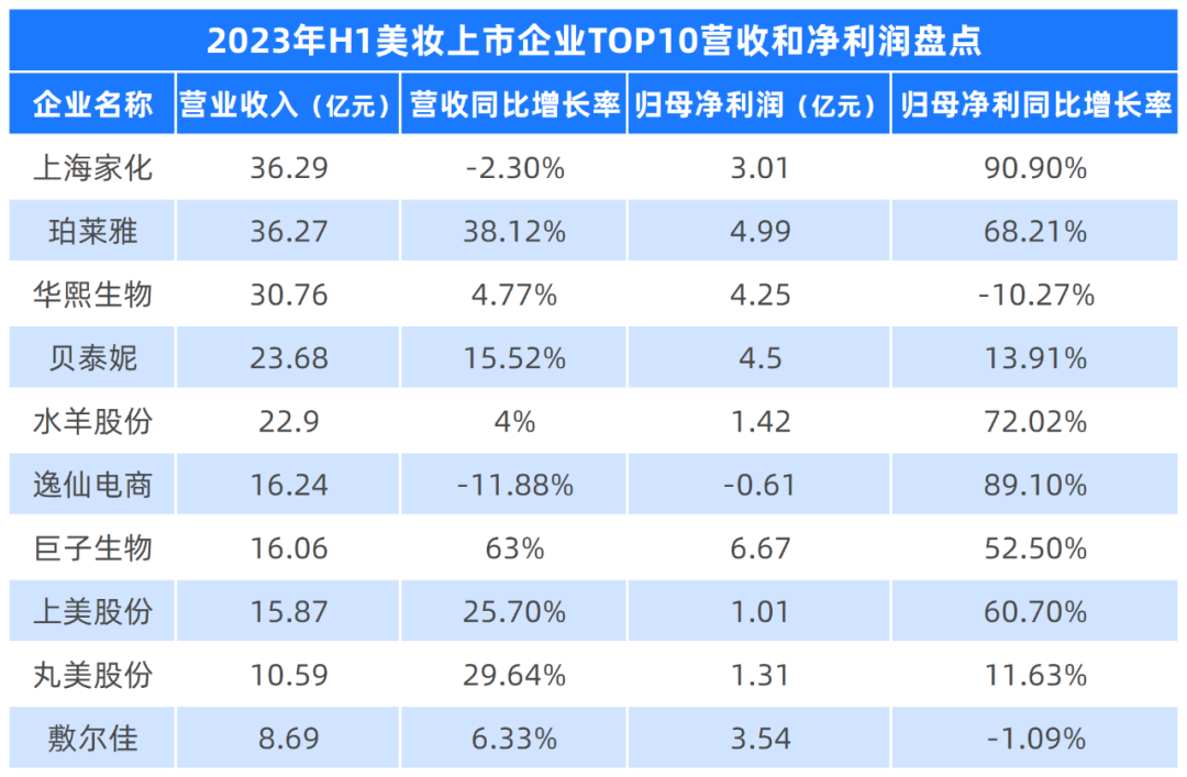 2023年上半年,營收超30億的美妝企業(yè)包括上海家化、珀萊雅和華熙生物;營收超20億的有貝泰妮和水羊股份;超10億元的包括逸仙電商、巨子生物、上美股份和丸美股份。另外需要提到的是,今年8月上市的敷爾佳,以上半年8.69億元的營收躋身TOP10,排在第10。